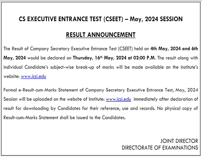 ICSI ने CSEET 2024 के परिणाम को लेकर मंगलवार, 14 मई को एक नोटिस जारी किया। इस अधिसूचना के मुताबिक स्टूडेंट्स को अपनी मार्कशीट को आधिकारिक वेबसाइट से डाउनलोड करना होगा और संस्थान की तरफ से उन्हें इसकी फिजिकल कॉपी जारी नहीं की जाएगी।