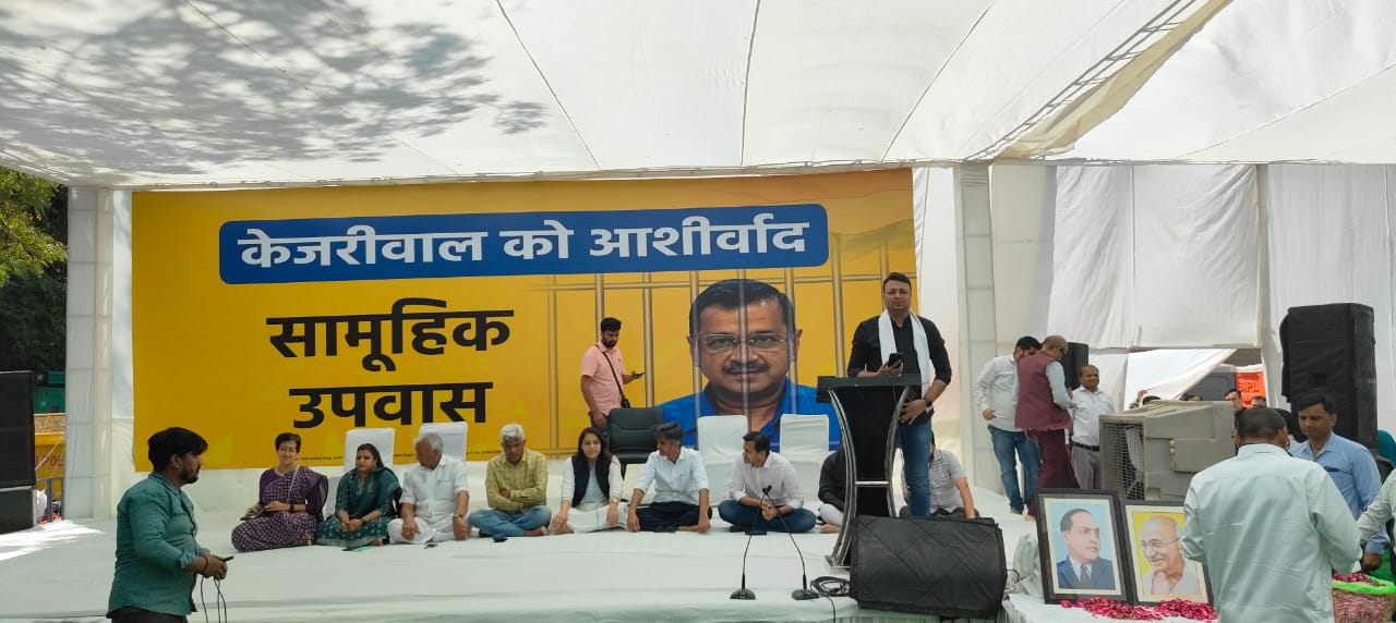 प्रयाग भारत, दिल्ली : केजरीवाल की गिरफ्तारी के विरोध में एक ओर जहां आम आदमी पार्टी आज रविवार को जंतर मंतर पर उपवास कर रही है। मंच पर आप के दिल्ली संयोजक व मंत्री गोपाल राय, मंत्री आतिशी,महापौर शैली ओबेरॉय सहित कई विधायक मौजूद हैं। मंच पर डॉ अंबेडकर और बलिदानी भगत सिंह के बीच में महात्मा गांधी की भी फोटो लगाई है।