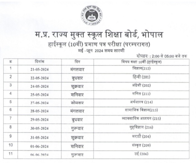 इसी प्रकार एमपीएसओएस बोर्ड द्वारा जारी हाई स्कूल टाइमटेबल (MPSOS 10th Date Sheet 2024) के अनुसार कक्षा 10 की परीक्षाएं 21 मई से शुरू होकर 6 जून तक आयोजित की जाएंगी। सबसे पहले 21 मई को विज्ञान विषय की परीक्षा होगी। अंतिम पेपर 6 जून को उर्दू भाषा का होगा। ये सभी परीक्षाएं निर्धारित तिथियों पर दोपहर 2 बजे से शाम 5 बजे तक आयोजित की जानी हैं।