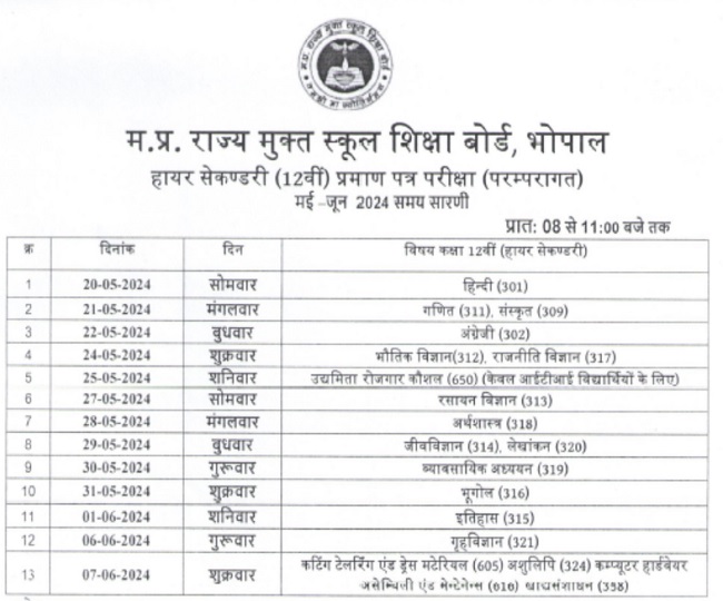 मध्य प्रदेश ओपेन स्कूल द्वारा जारी टाइम टेबल (MPSOS 12th Date Sheet 2024) के अनुसार कक्षा 12 की बोर्ड परीक्षाएं 20 मई से 7 जून तक आयोजित की जाएगी। सबसे पहले 20 मई को हिंदी की परीक्षा होगी और सबसे आखिर में 7 जून को कटिंग टेलरिंग एंड ड्रेस मैटेरियल, आशुलिपि, कंप्यूटर हार्डवेयर असेंबली एंड मेटेनेंस और खाद्य संशाधन के पेपर आयोजित किए जाएंगे। सभी परीक्षाएं निर्धारित तारीखों पर सुबह 8 बजे से 11 बजे तक की एकल पाली में आयोजित की जानी है।