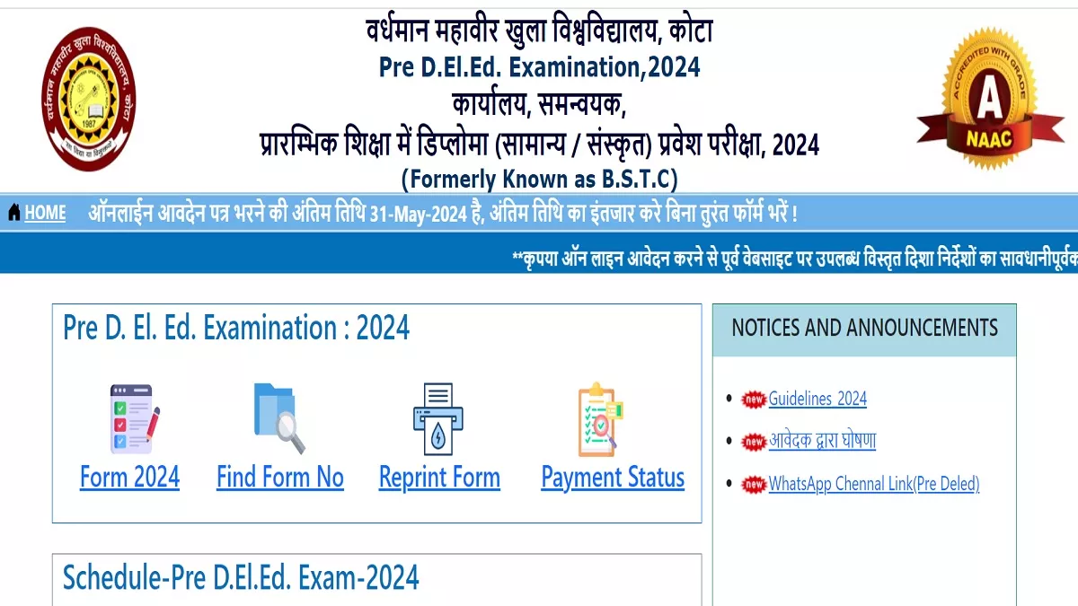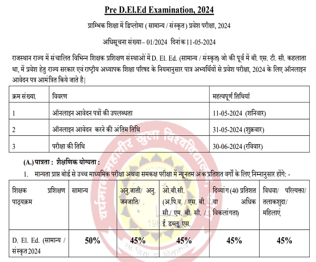 प्रयागभारत, नई दिल्ली: राजस्थान राज्य से डीएलएड में प्रवेश लेने के इच्छुक स्टूडेंट्स के लिए महत्वपूर्ण खबर है। वर्धमान महावीर ओपन यूनिवर्सिटी कोटा की ओर से राजस्थान बीएसटीसी 2024 एंट्रेस एग्जाम के लिए नोटिफिकेशन जारी कर आवेदन प्रक्रिया शुरू कर दी गई है। एप्लीकेशन फॉर्म केवल ऑनलाइन माध्यम से विश्वविद्यालय की ऑफिशियल वेबसाइट predeledraj2024.in पर जाकर या इस पेज पर उपलब्ध करवाए गए डायरेक्ट लिंक पर क्लिक करके भरा जा सकता है। एप्लीकेशन फॉर्म भरने की अंतिम तिथि 31 मई 2024 निर्धारित की गई है।