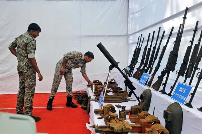 ये हथियार बरामद हुए: BGL रॉकेट लांचर-1, 12 बोर राइफल-6, सिंगल शॉट राइफल-3, देशी कट्टा-1, 12 बोर राइफल बैरल-1, सिंगल शॉट बैरल-2, BGL बैरल-3