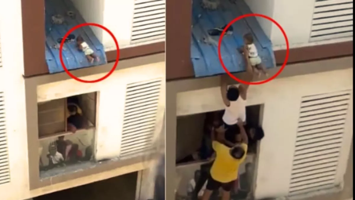 बालकनी के प्लास्टिक शीट पर लटका हुआ था बच्चा, लोगों ने अनोखे तरीके से मासूम की बचाई जान